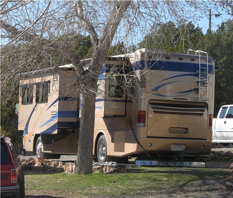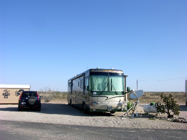 After a long day, our longest drive ever of 437 miles, we were camped at The Ranch SKP Co-op in Lakewood, New Mexico. It was windy but the place is very friendly. Their free wi-fi was being flakey and our antenna and amplifier were unable to give us a reliable aircard internet signal so we put up the dish in the wind, luckily the motorhome blocked the wind from hitting the dish: