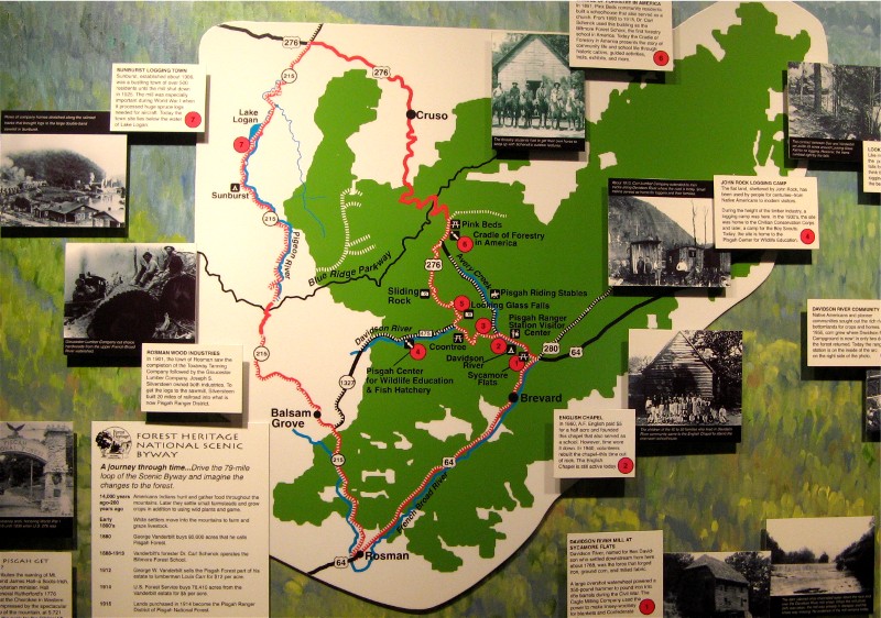 It was lunch time and the nearest decent sized town was Brevard, miles down US276. US276 into Brevard is a wild ride since the highway drops in elevation and has many switchbacks. On the GPS screen we could often see three pieces of the highway displayed. We were disappointed to see the Cradle of Forestry Center was closed for the season, it was not opening until May.