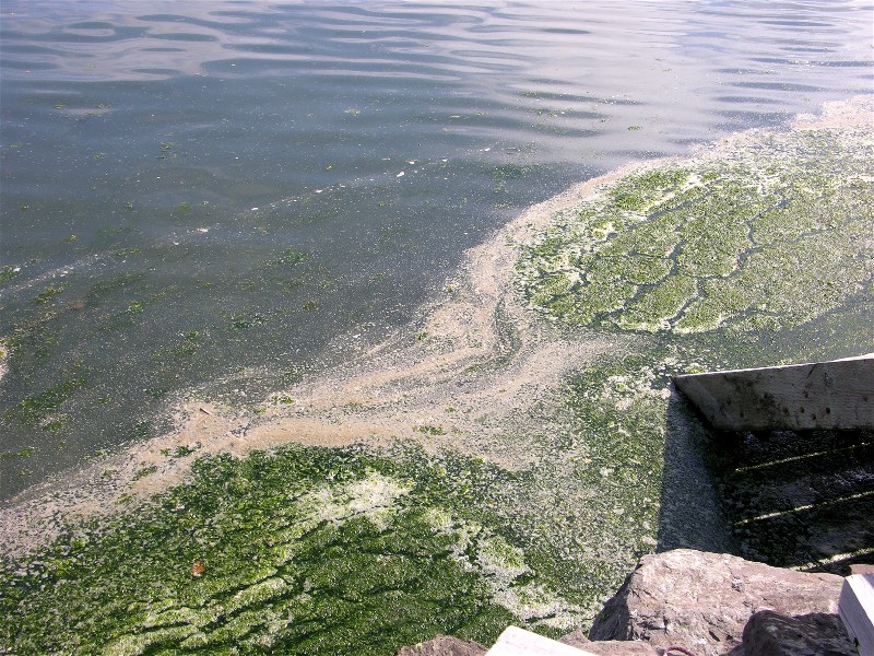 After a windy day the water is full of seaweed fragments: