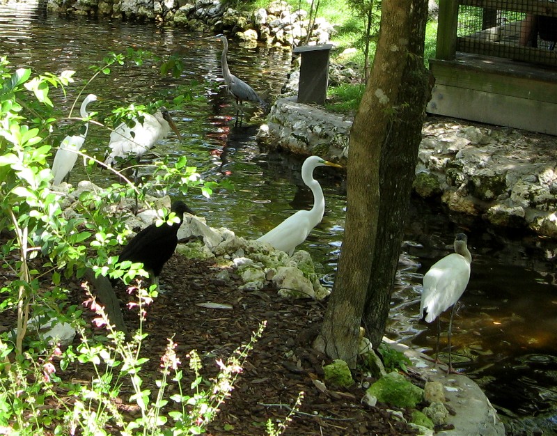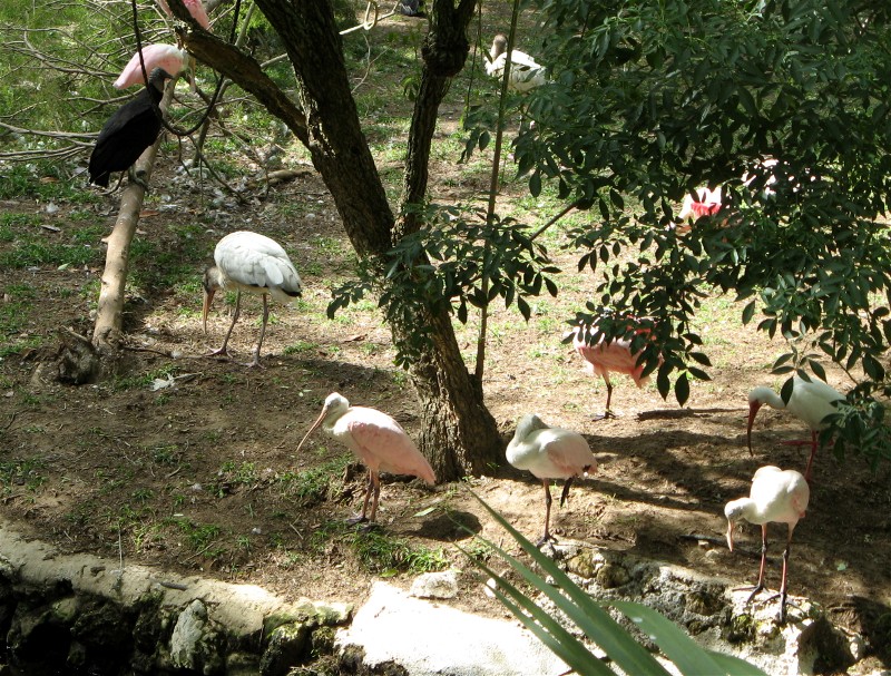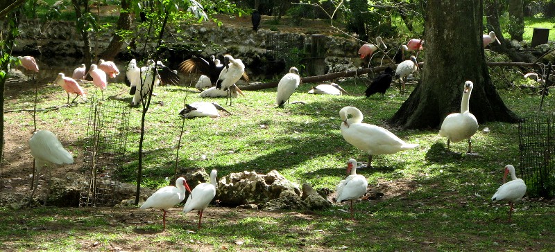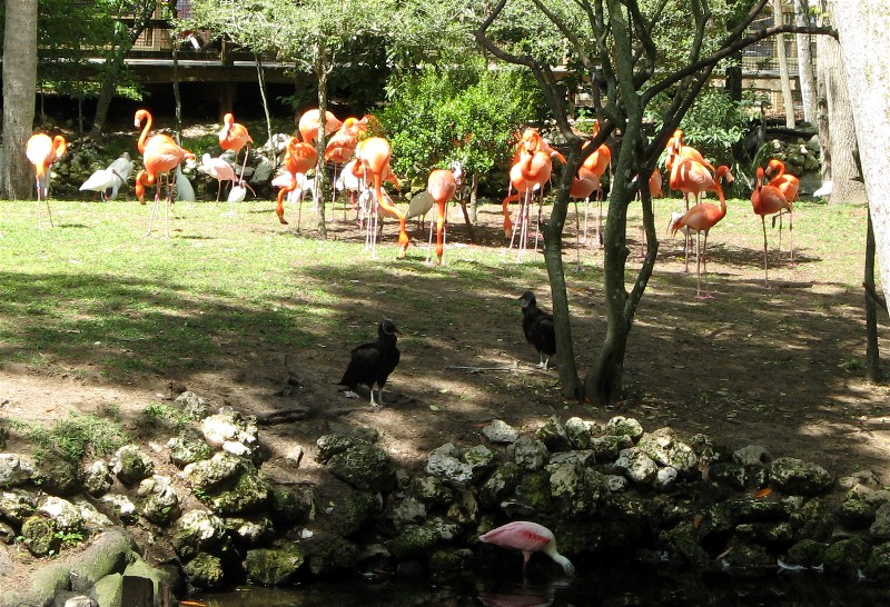 American flamingos in the back, with some wood storks and white ibis visible behind them. Black vultures and roseate spoonbill up closer: