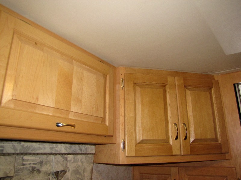 We are done in the rear with the new cabinet doors, which David stained himself. The cabinet handles came out of the toilet room, which now has coordinating handles since the old handles are no longer available.