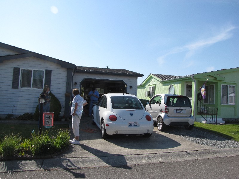 Diane, Pat and Dick in front of the house with Pat's VW Bug and Dick's new Smartcar.