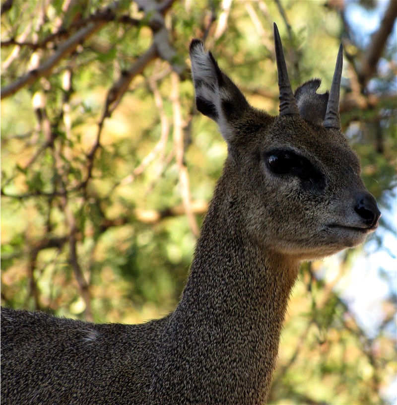 A klipspringer about to jump over a rock hyrax that is giving it the eye: