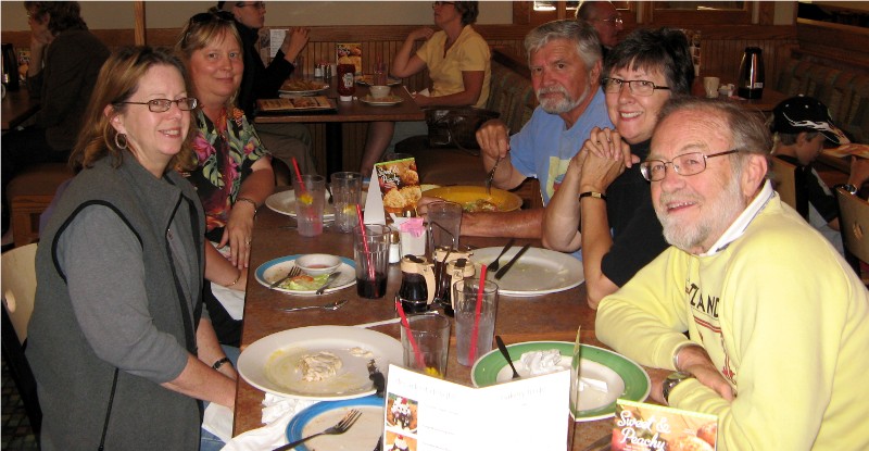 Margaret with Diane in back on left, Ian, Jo and Fred front to back on right. This was our much cheaper meal at Perkins the second night.