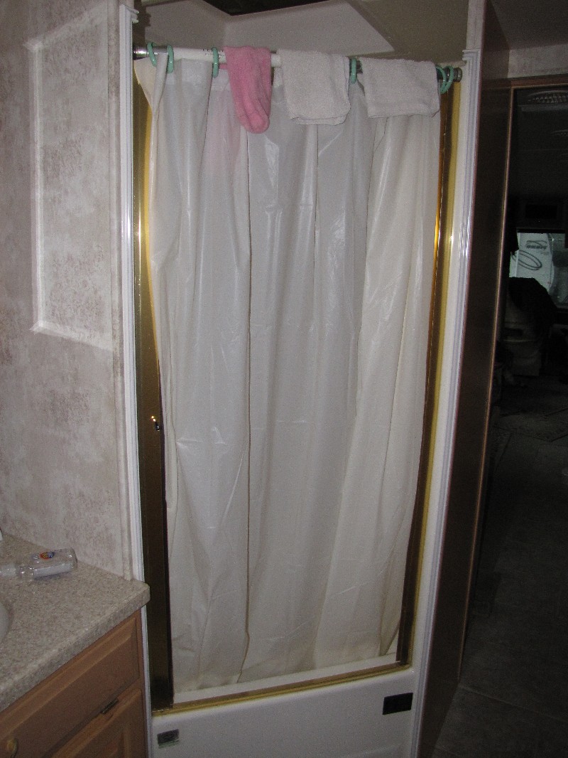 Our temporary solution was to use a tension rod we already had and a shower curtain and rings from the dollar store:
