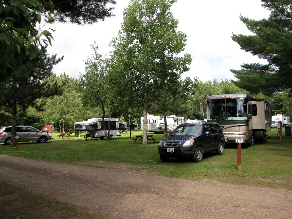 On the 21st we had to leave the campground since we were losing our half price camping due to the weekend. We headed north to a campground that had room for us, and for about the same price as the last was with Passport America. Here we are in Pine Harbor Campground in Chippewa Falls, Wisconsin after 161 miles. Our campsite is very wide, it runs between the red posts with numbers on it so the picnic table visible is in our campsite.