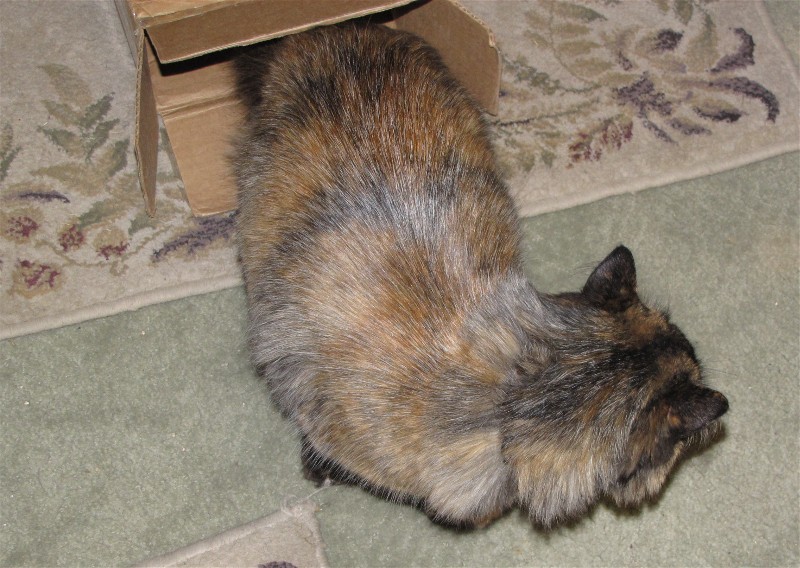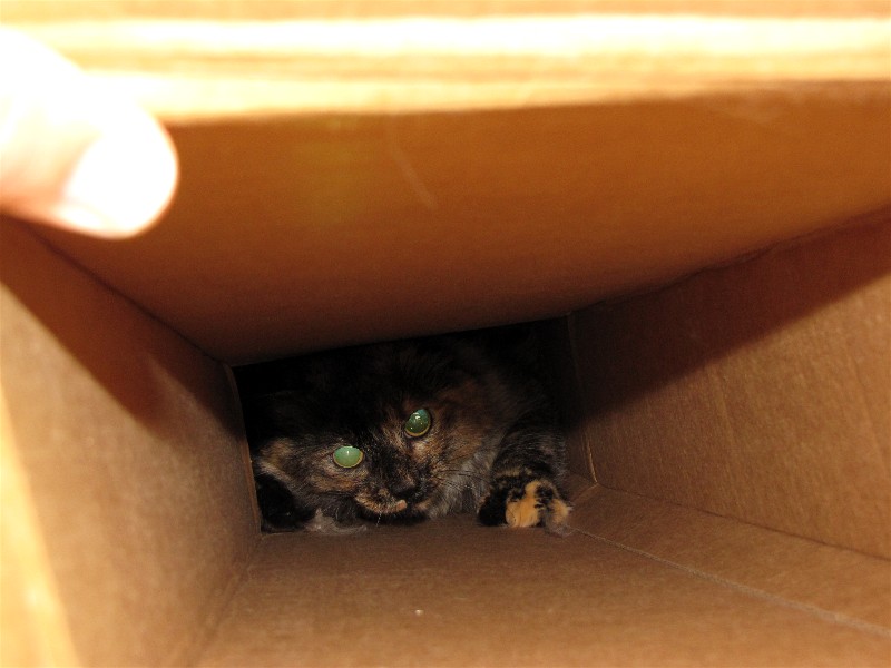 We laid the box on the ground and she came out. Typical cat behavior.