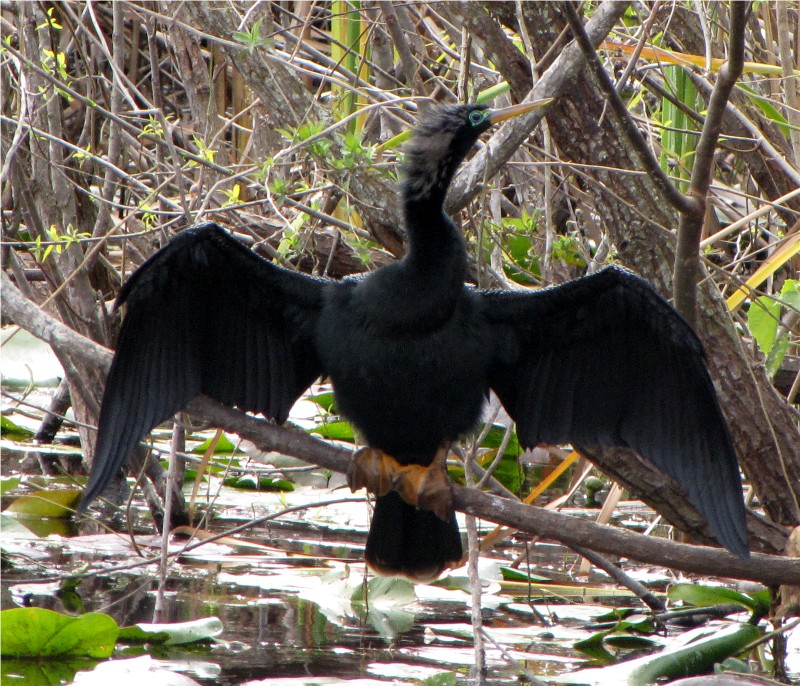 A male anhinga with breeding colors around the eyes.