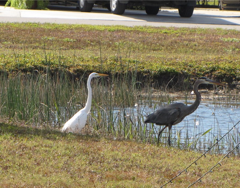 We were glad the weather was warm again. Now we could get out and see some of the wildlife. Of course we don't have to go far. Here are a great egret and a great blue heron visible from our motorhome.