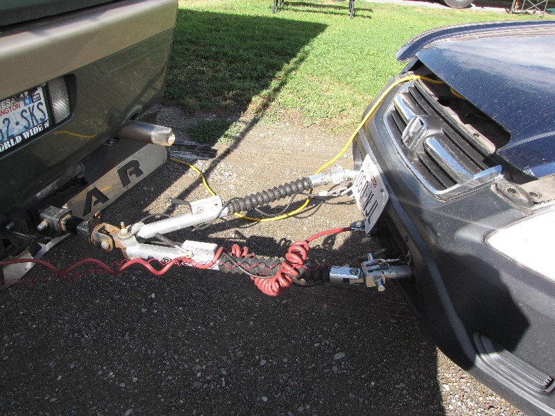 The yellow cord was hooked to a battery charger which we use when we leave the car hooked up at night to top off the car battery. The CRV has a little battery and it does not reliably stay charged over two days of travel.