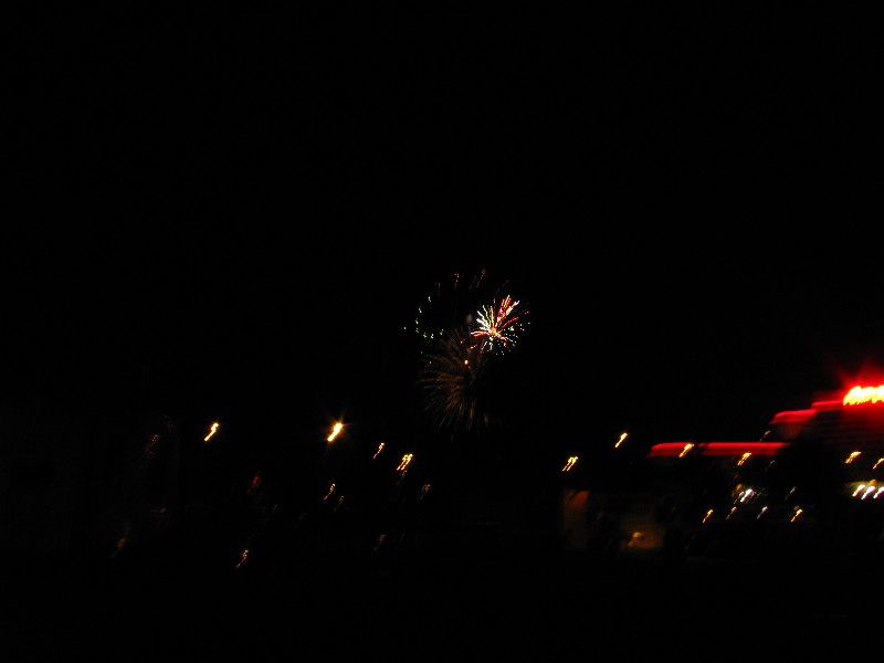The Pow Wow had fireworks scheduled at 10PM. But they actually started at 9:50PM and startled us all with the noise. Evita went behind the couch. We did not realize we had a good spot to see the fireworks so we did not have a tripod set up for the camera so we had to take handheld photos. Here is what a handheld photo looked like: