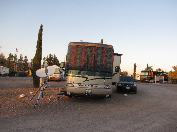 Soon we took NM-80 south which became AZ-80 when it crossed into Arizona. This was something of a time zone change since we went from Mountain Daylight Time to Mountain Standard Time, since Arizona does not implement Daylight Time. 80 is a lonely road and at least one third of the vehicles we saw were Border Patrol. Our plan had been to camp in Bisbee but the only campground was full so they suggested Turquoise Valley Golf and RV Park in Naco, a few miles south. We called and were told to pick a site then come pay at the pro shop. So we pulled in, picked a site, and Diane went to pay. She found out they had assigned us a campsite but it was probably OK to be where we were at. A few minutes later they called and said we did have to move to the assigned campsite. Luckily our phone stayed with American towers since we are next to Mexico. We are not sure the campsite we initially tried was ever filled during our stay.
