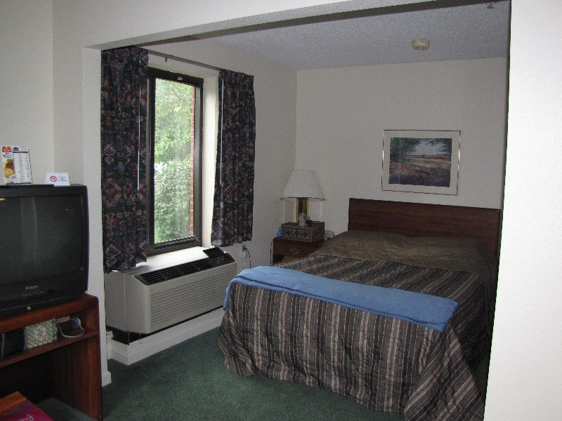Photos of our first floor corner motel room. They supplied a box so we could hook the Wii up. Plus we have places for computers and wifi.