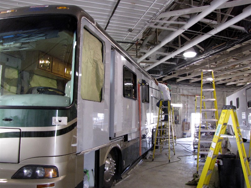 We are here to get our outside walls replaced due to a fiberglass defect. We feel lucky Newmar is still alive since the other RV manufacturers with the same issue have gone bankrupt, though two are back in operation after reorganization. Newmar is sharing the cost of our repair.