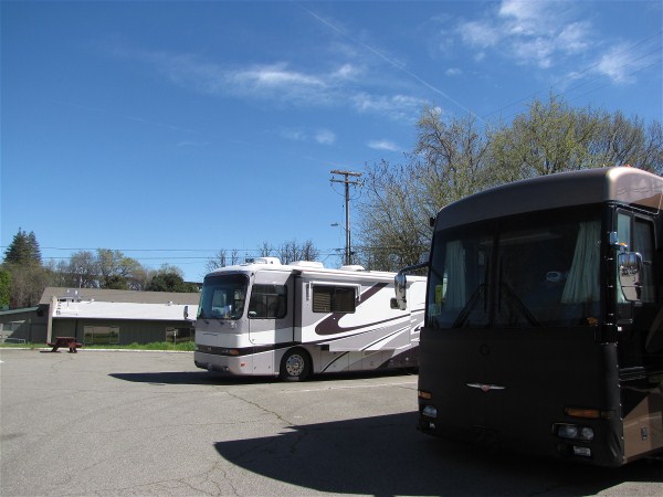 April 1st was also hot but we took off anyway since we had to get north quickly. Our original plan was to stop at the Fresno Elks but they were full so we called ahead to the Modesto Elks and they had room, but please come in after 7:15PM since the parking lot was full due to a funeral. We stopped and had dinner at a rest area and after 357 miles we arrived at the Modesto Elks about 7:30. This is what we looked like after dark.