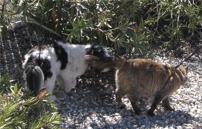 This is how Pandi helps. Pandi knows not to get too close to Evita's front claws.