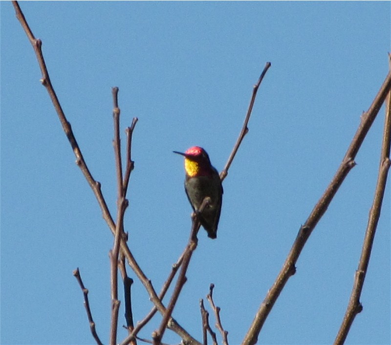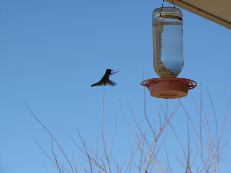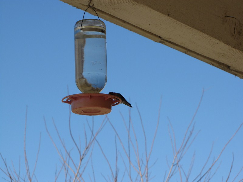 The other main hummingbird, who never stopped close by but what nice colors. It is probably a Rufus Hummingbird where the light is making the neck look yellow in this photo, but most of the time the neck looked red.