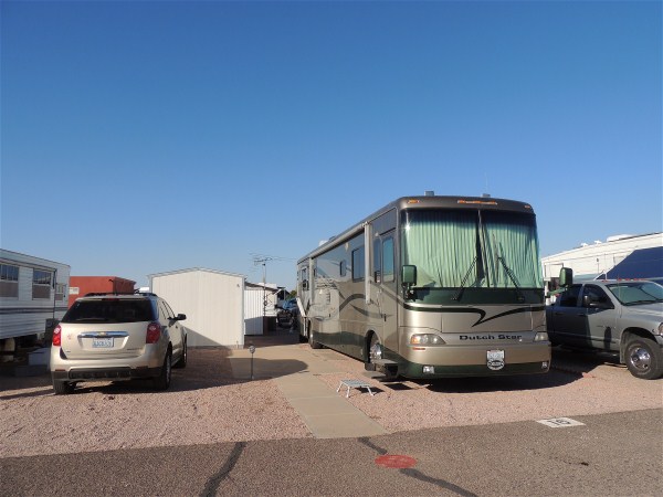 After lunch we got back on the road and traveled 70 miles to Rover's Roost SKP Co-op in Casa Grande, AZ. We were last here 4 years earlier and in the same campsite.