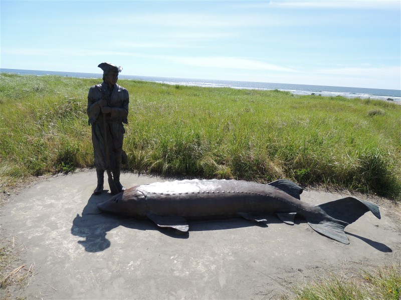 A statue of a sturgeon with a member of the Lewis and Clark Expedition.