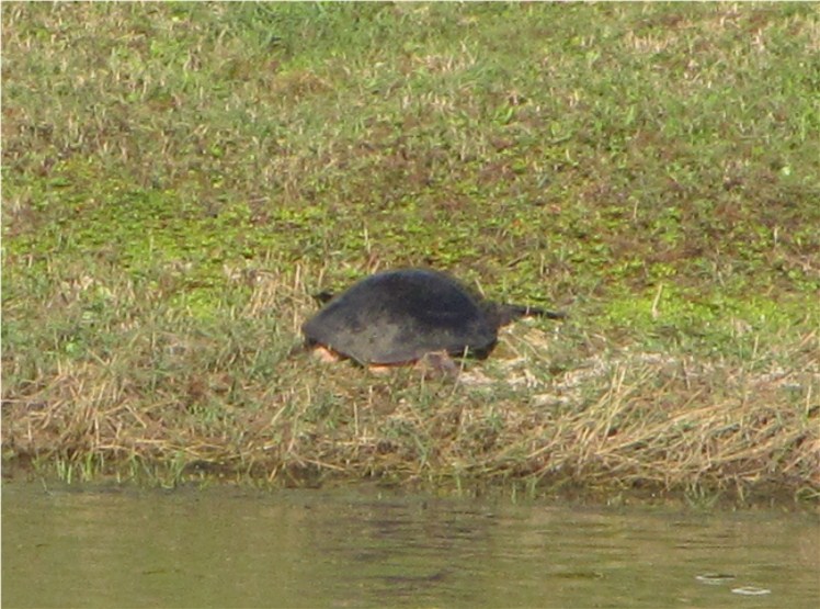 The same turtle watching a White Ibis with a smaller turtle coming out of the water.