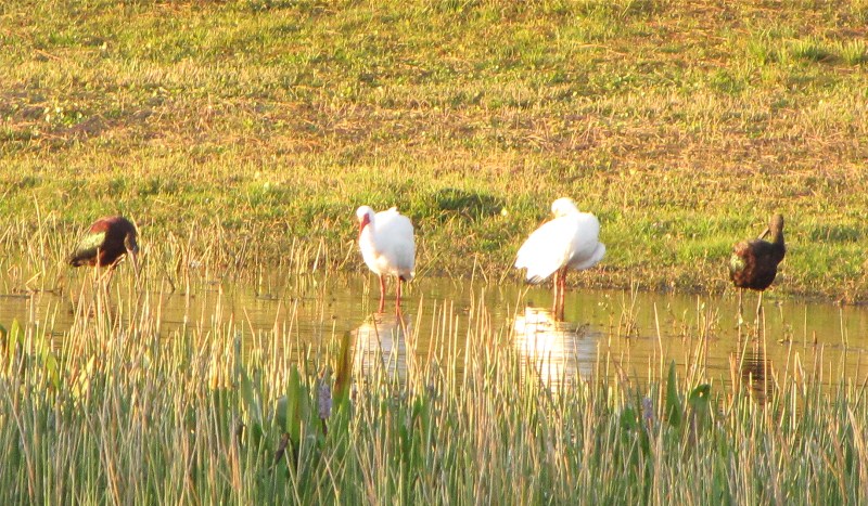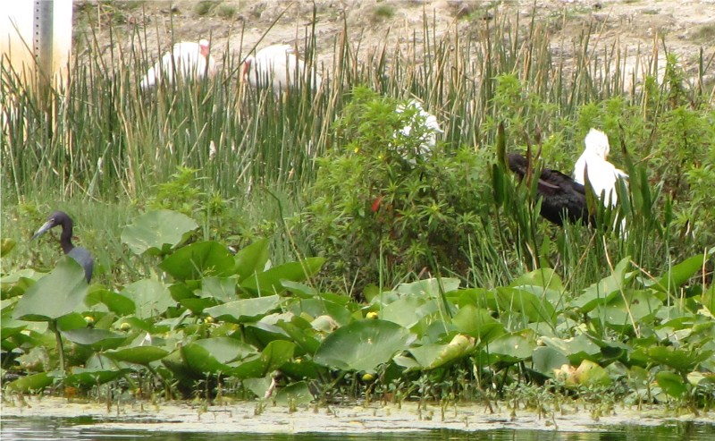 Little Blue Heron, Snowy Egret and Glossy Ibis with White Ibis in the background.