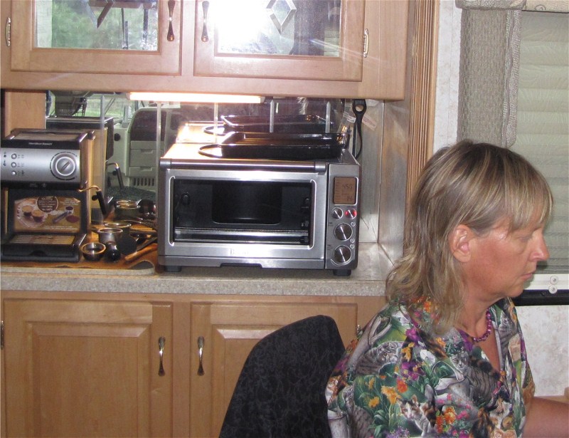 While sitting still we can buy stuff mail order so we bought a Breville Smart Oven. You can see it behind Diane and next to the espresso machine. This is a very fancy toaster/oven and for the first time since being in an RV we will be able to broil. We bought it because a couple sets of friends have bought them and are very happy. It is big and required us to do some rearranging to find a place for it. But this is a better location for a toaster since it is further away from our smoke alarm, which we have tested regularly without wanting to.