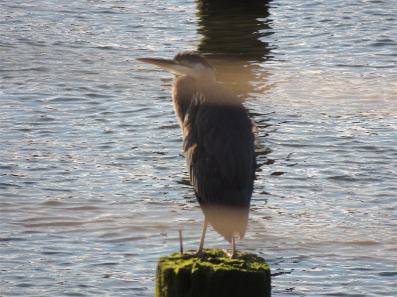 A Great Blue Heron just outside the restaurant is slightly obscured by railings.