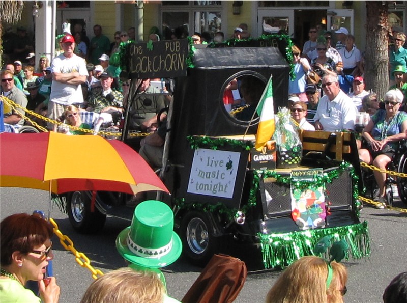 We were able to find a spot for the four of us at one of the corners of the Sumter Landing Town Square. Next to us a group had set up for the duration, with food and drink. They were having lots of green Jello shots.