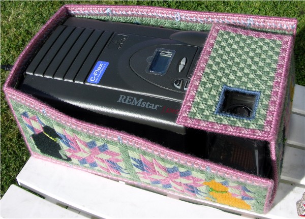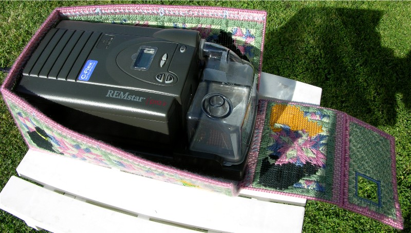 Diane's CPAP sits on a nightstand by the bed and Evita decided it was a great place to sit or stand on. This is a problem since she can push buttons and turn it on and off at 3AM. Diane decided she would make a CPAP cover.