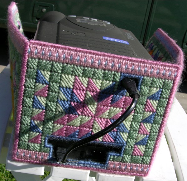 This view shows how much light and air can come through the cover, the CPAP needs to breath so the yarn is open: